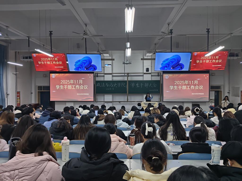 11月25日晚,政法与历史学院全体学生干部大会在思贤楼520教室召开。学院党委副书记、副院长王静,院团委书记马玲,辅导员刘晨以及全院学生干部参加。