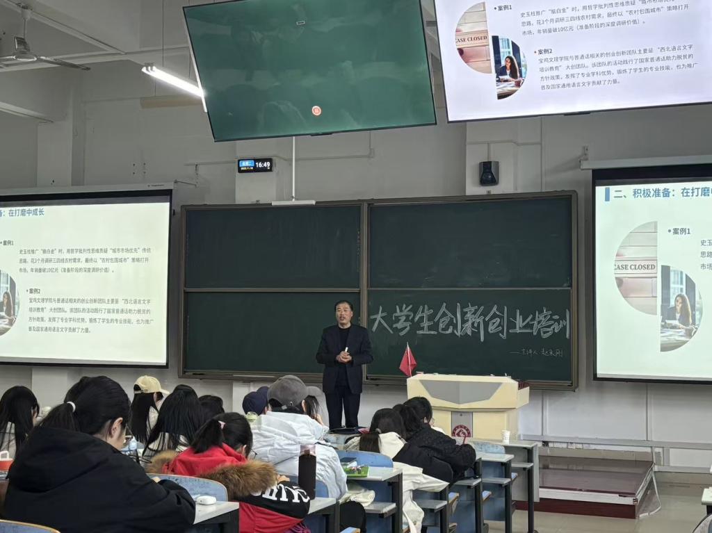 11月17日下午,我院特邀教育部职业规划师、就业导师、宝鸡职业技术学院就业创业中心主任赵永刚老师,在思贤楼119教室开展了《从“理论殿堂”到“实践赛场”:哲思专业如何开展创新创业》专题讲座,2025级思想政治教育专业与哲学专业全体学生参会聆听。